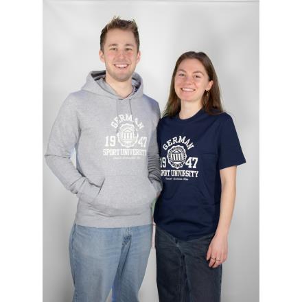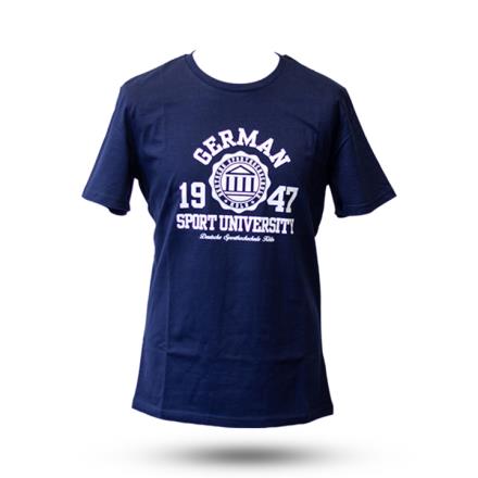 Das navyblaue T-Shirt im Collegestil überzeugt durch sein zeitloses Design und hohen Tragekomfort. Auf der Vorderseite ist ein weißer Print mit dem Schriftzug "German Sport University", dem Gründungsjahr 1947 sowie einem stilisierten Universitätswappen angebracht. Das Shirt vereint sportliche Lässigkeit mit akademischem Flair und ist sowohl für den Alltag als auch für sportliche Aktivitäten ideal geeignet.