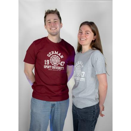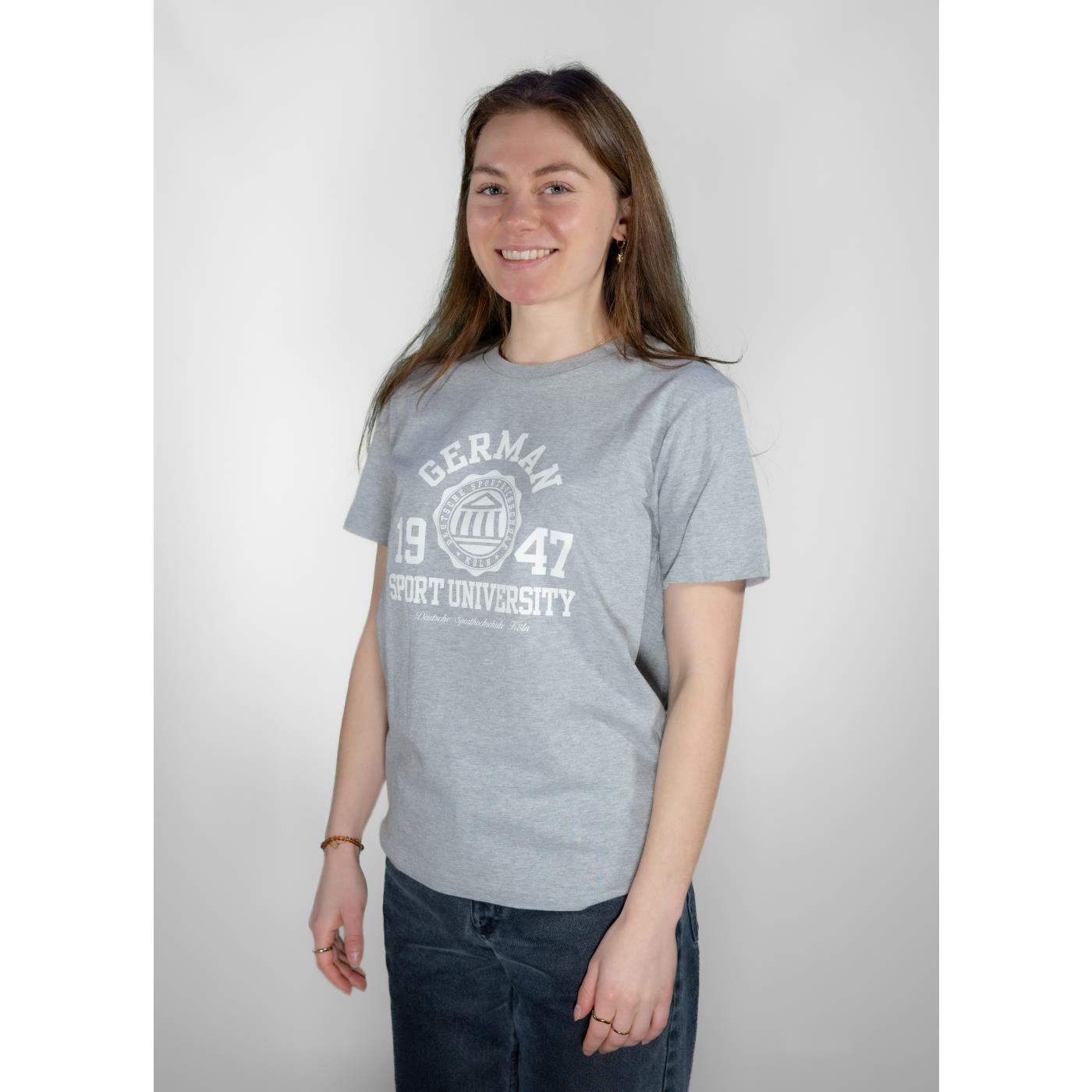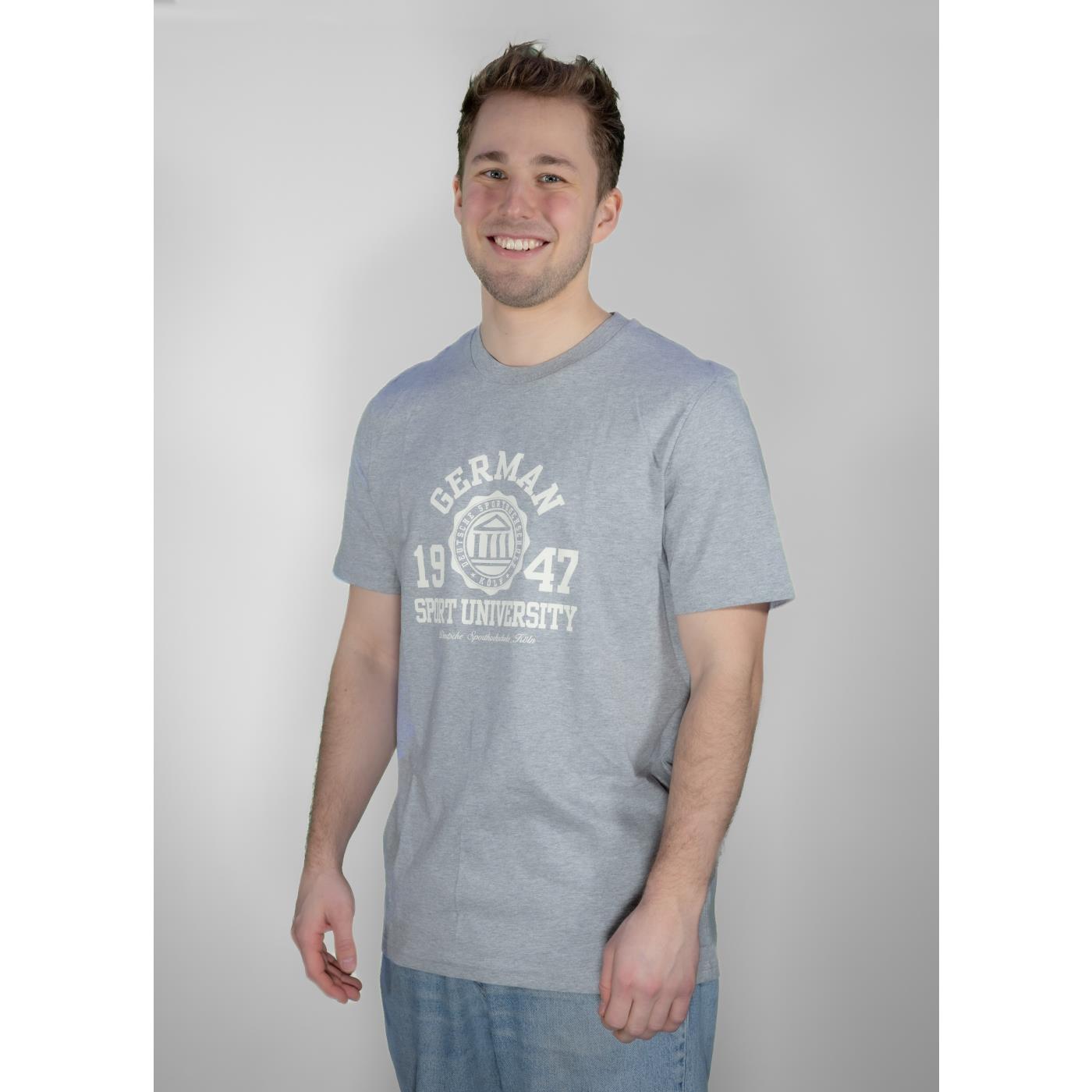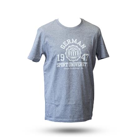 Das graumelierte T-Shirt im Collegestil überzeugt durch sein zeitloses Design und hohen Tragekomfort. Auf der Vorderseite ist ein weißer Print mit dem Schriftzug "German Sport University", dem Gründungsjahr 1947 sowie einem stilisierten Universitätswappen angebracht. Das Shirt vereint sportliche Lässigkeit mit akademischem Flair und ist sowohl für den Alltag als auch für sportliche Aktivitäten ideal geeignet.
