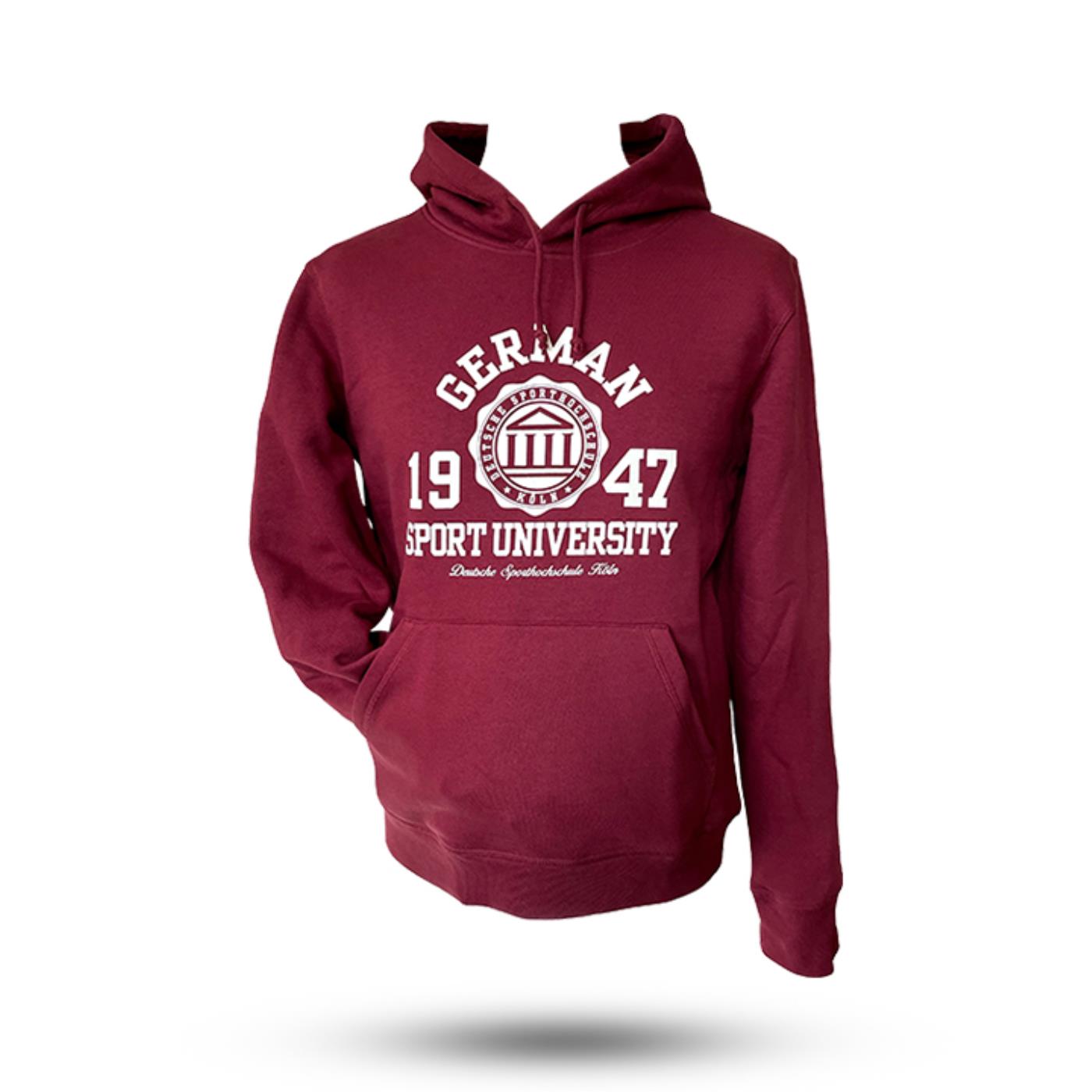 Mit diesem burgundfarbenen Hoodie trägst du ein Stück Universitätsgeschichte. Der große Frontprint mit dem Schriftzug "German Sport University 1947" und dem markanten Siegel macht ihn zu einem echten Blickfang. Perfekt für alle, die sportliche Lässigkeit mit akademischem Flair kombinieren möchten. Der Hoodie ist aus weicher Baumwolle gefertigt, für ein kuscheliges Tragegefühl. Kapuze mit Kordelzug und eine praktische Kängurutasche kombiniert mit einem weiteren Schnitt sorgen für Funktionalität und Komfort. Ideal als Überzieher vor und nach dem Sport bei kühleren Tagen.