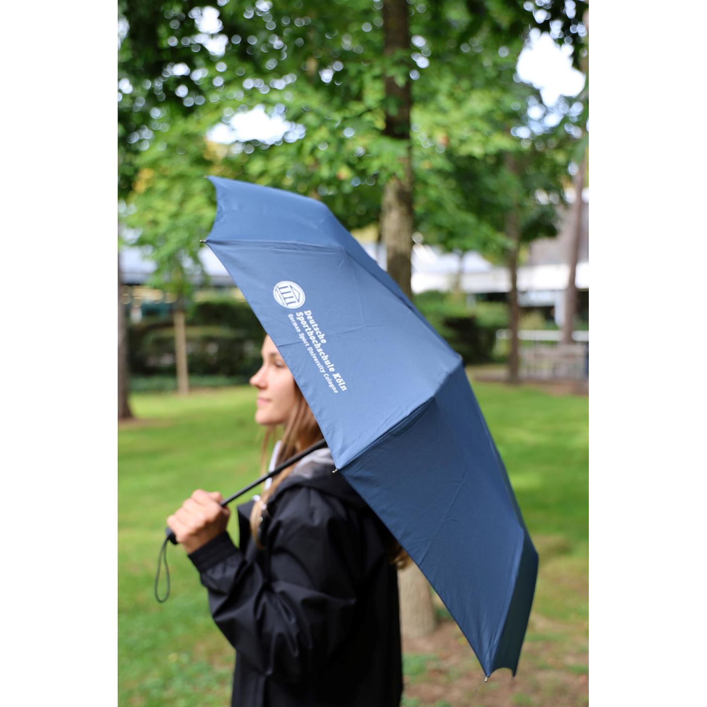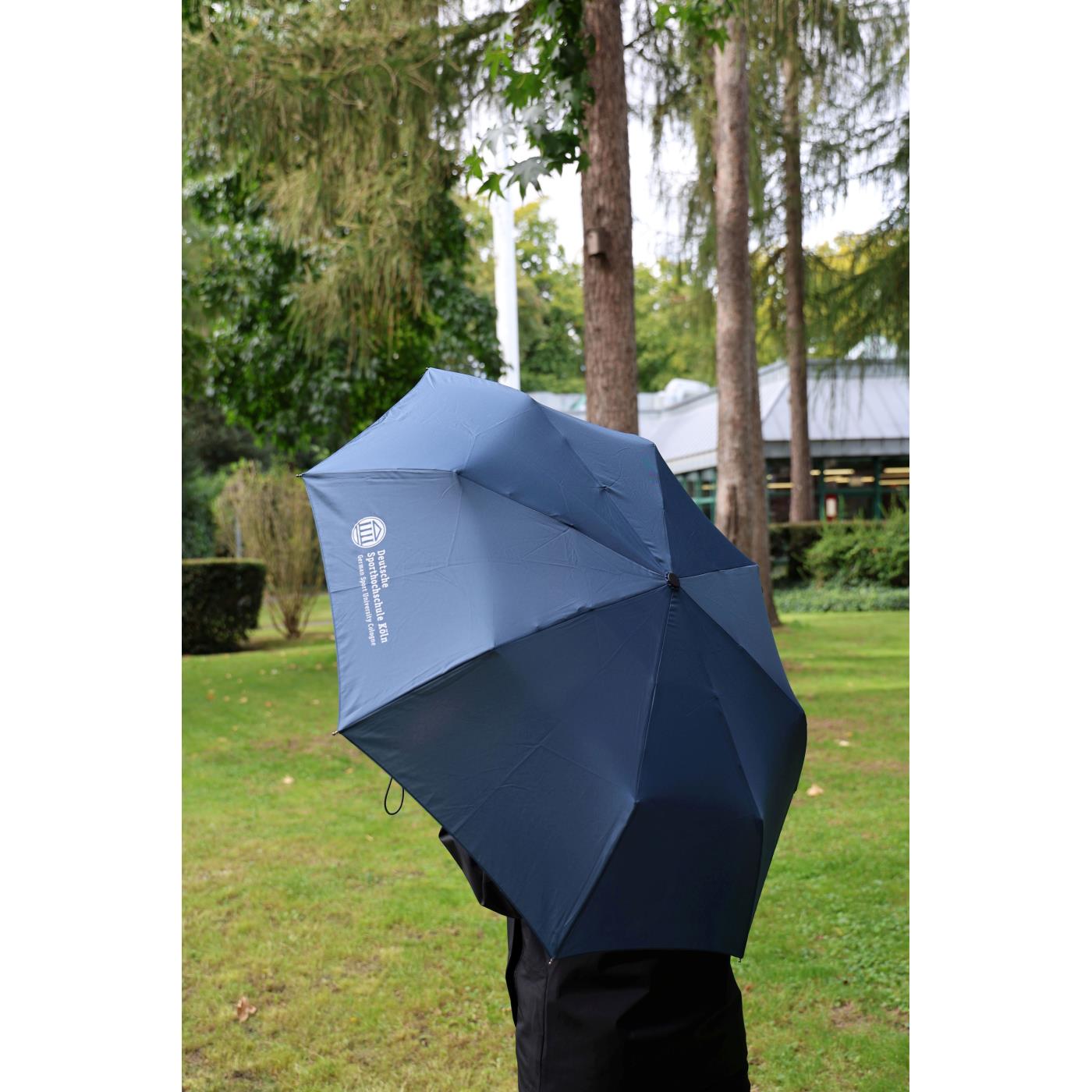 Stabiler, dunkelblauer Regenschirm (Knirps) mit dem weißen Logo und Schriftzug der Sporthochschule. Perfekt für regnerische Tage - kompakt, robust und elegant.